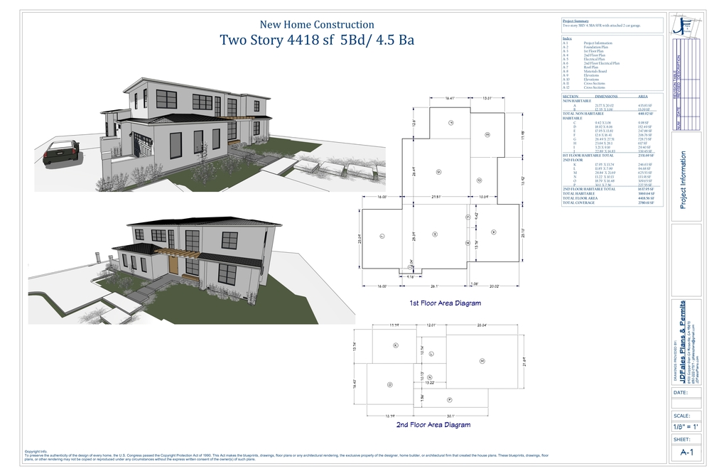 This two-story residence is 4418 sf. Approximately 65 ft wide x 63 ft deep. This plan has 5 Bedrooms and 4.5 Bathrooms. The entry opens to a raised ceiling an open winding staircase and a convenient Powder Room. The massive Great Room and all glass sliding wall provides tremendous light and natural ventilation to the heart of the home. The Kitchen is spacious with a 6 seat Island and a large pantry. A mud room connects the Garage, Pantry, and Kitchen for easy access. The Breakfast Nook and Dining Room are directly adjacent surrounded by glass with more access to the rear. The right side of the house features a Jr Suite with a private bathroom and an Office just off the Great Room. The wide staircase leads upstairs to the Family Lounge. Close by are two more bedrooms. Each with its own bathroom and walk-in closet. The Laundry is located upstairs for convenience. The Primary Bedroom, Bathroom, and Walk-in closet dominate the right side of the 2nd floor. The Primary Bathroom features his & hers vanities, a large Garden Tub, a large Walk-In shower, and a private water closet. The Walk-In Closet is large enough to facilitate an island and dressing bench.